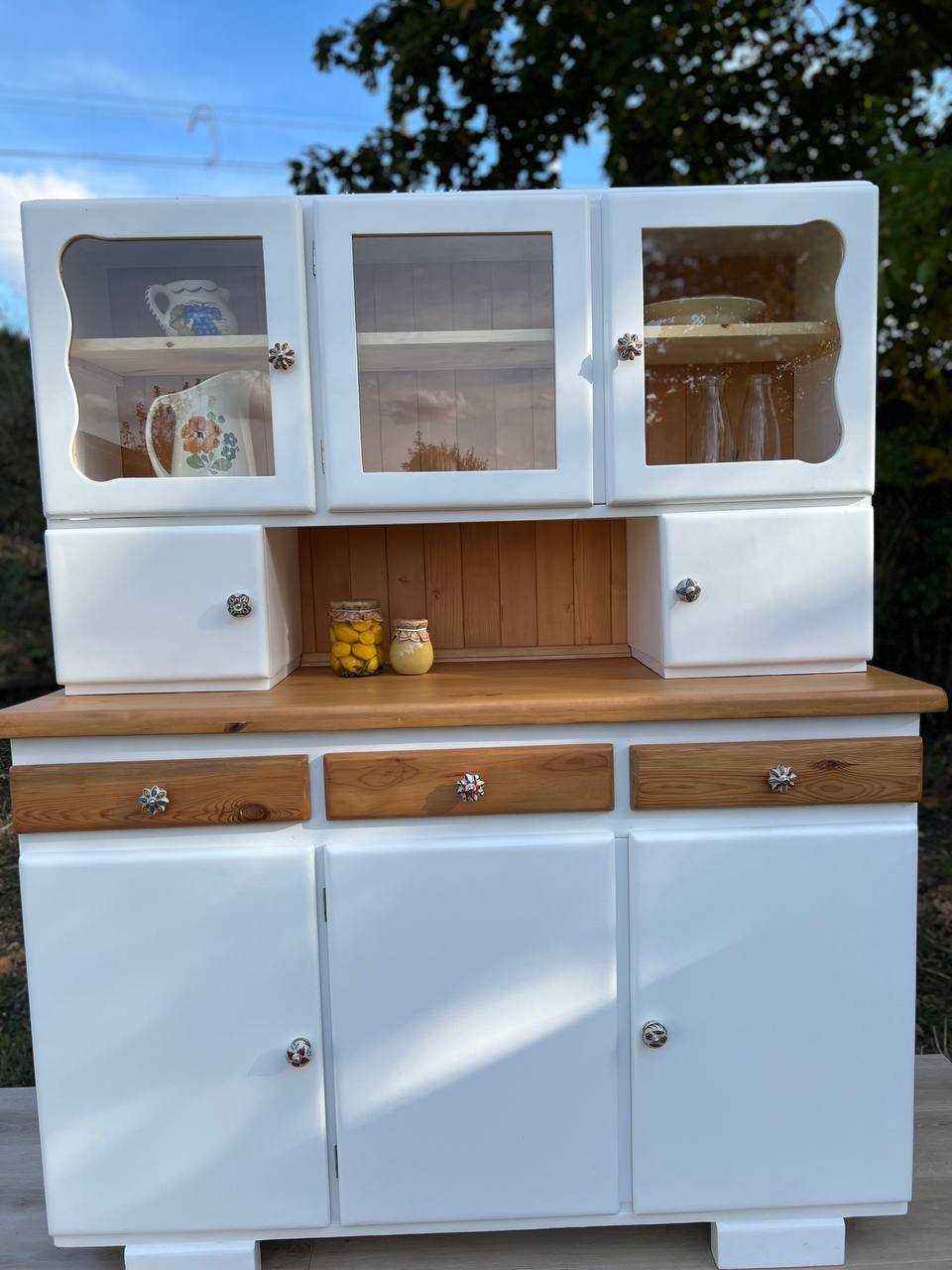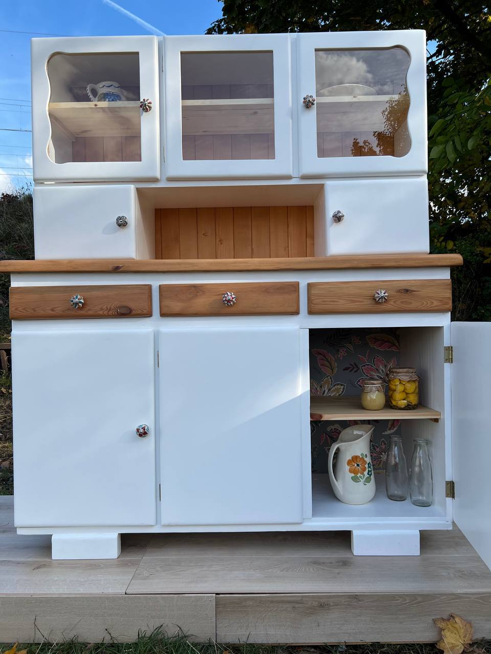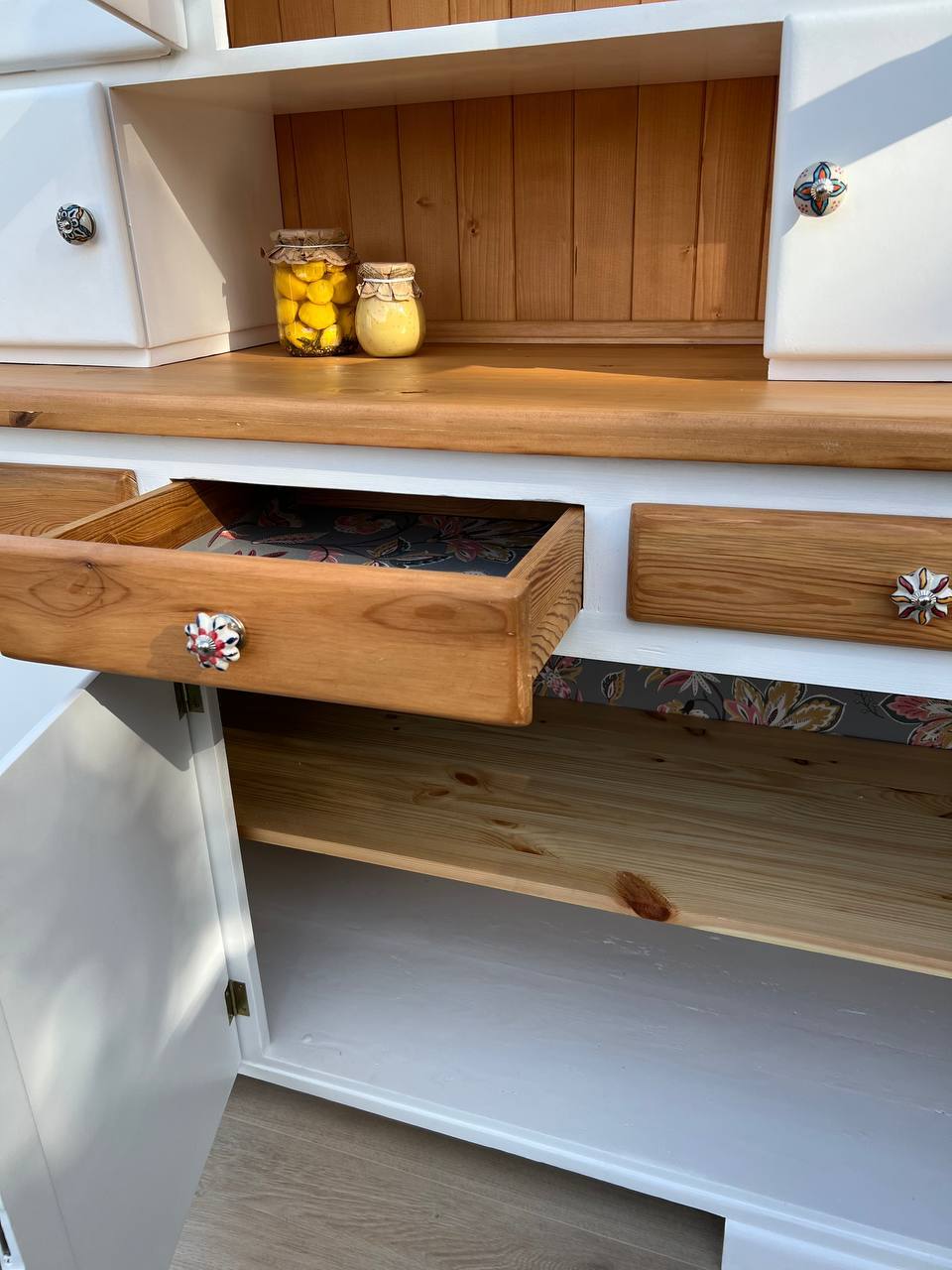 „Biały Bukowy” to wyjątkowy egzemplarz kredensu kuchennego z czasów PRL, który został starannie odrestaurowany i zachwyca swoją prostotą oraz subtelnym połączeniem jasnych barw z naturalnym pięknem drewna bukowego.