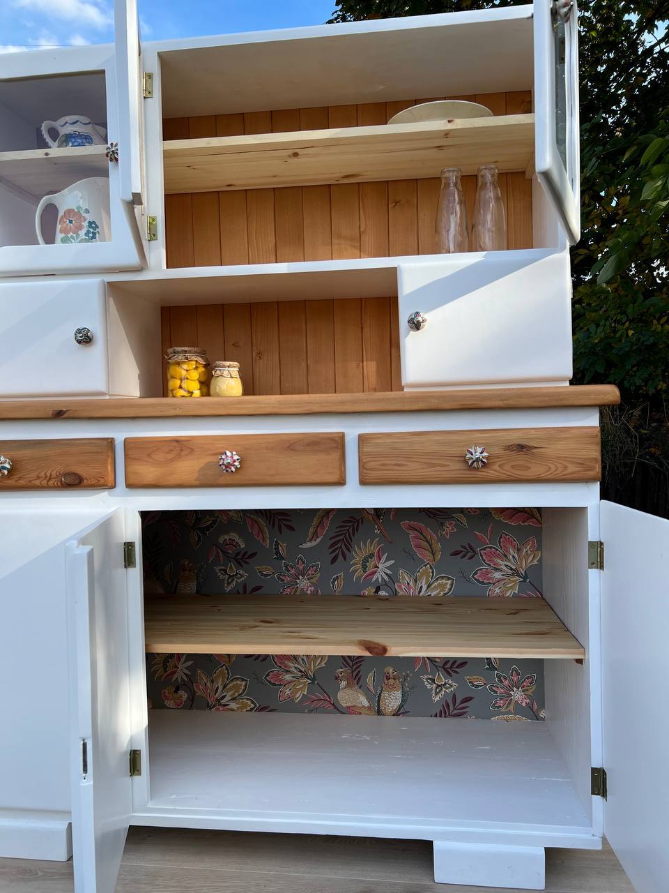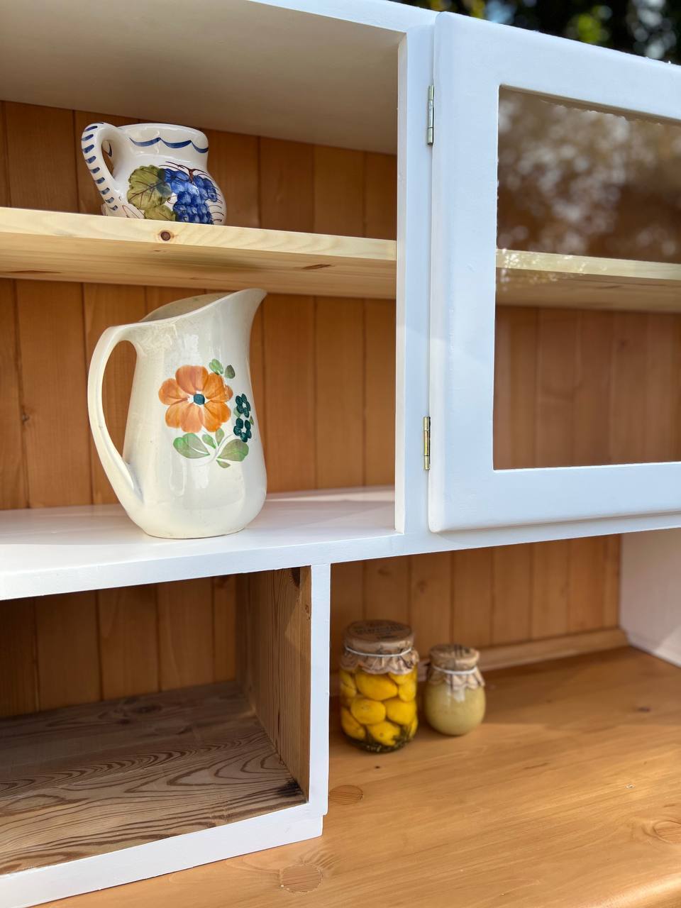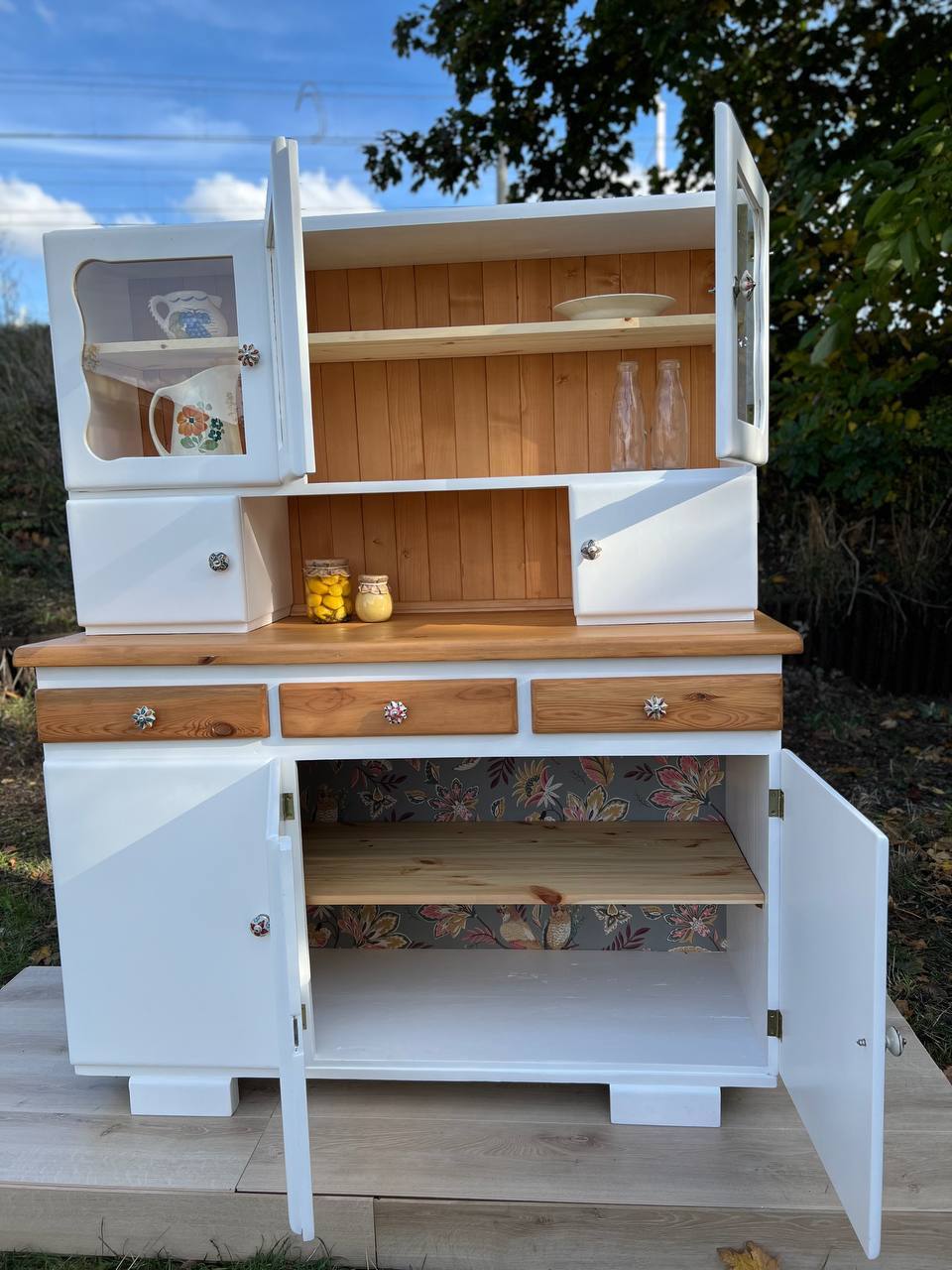 „Biały Bukowy” to wyjątkowy egzemplarz kredensu kuchennego z czasów PRL, który został starannie odrestaurowany i zachwyca swoją prostotą oraz subtelnym połączeniem jasnych barw z naturalnym pięknem drewna bukowego.