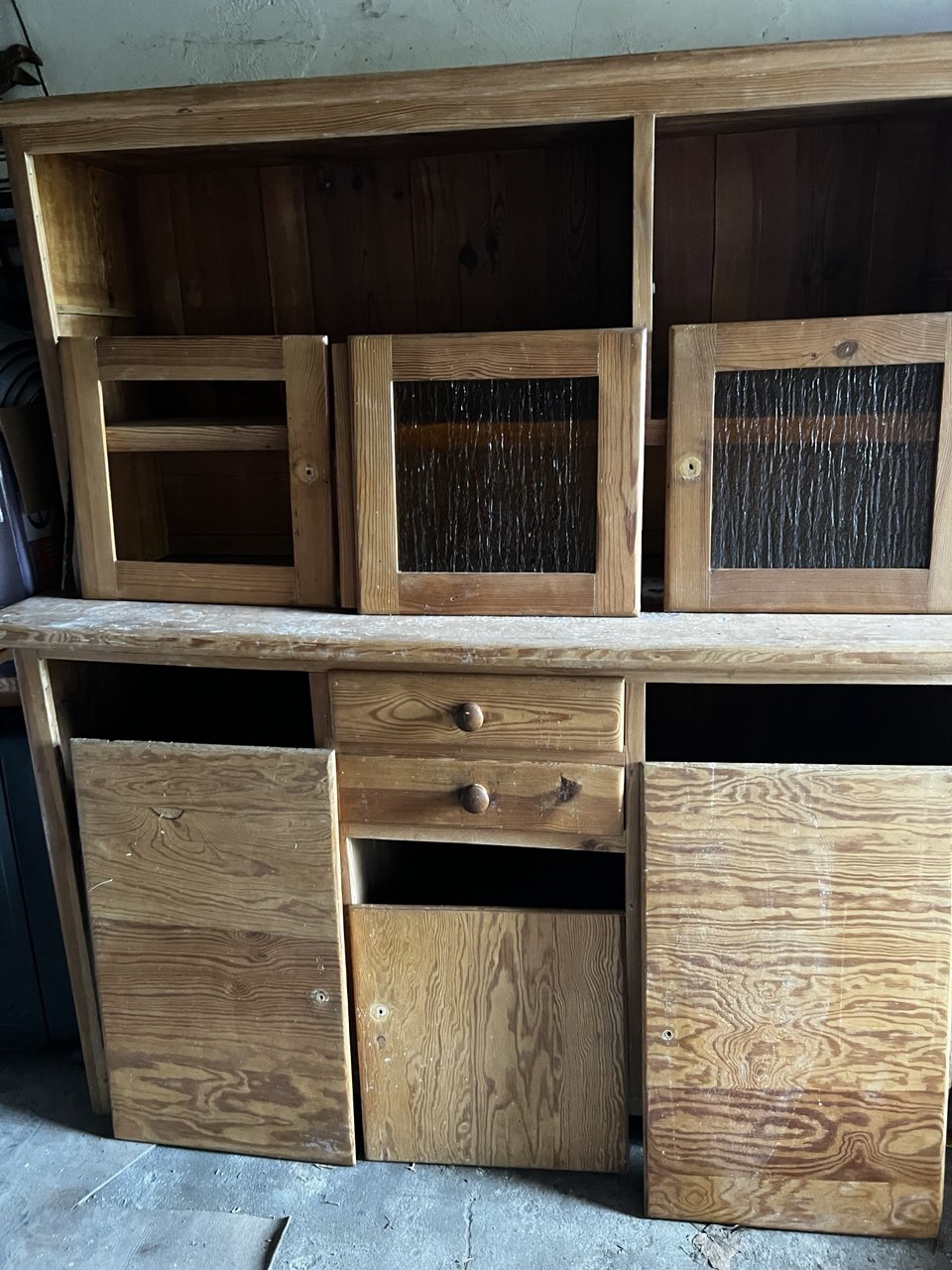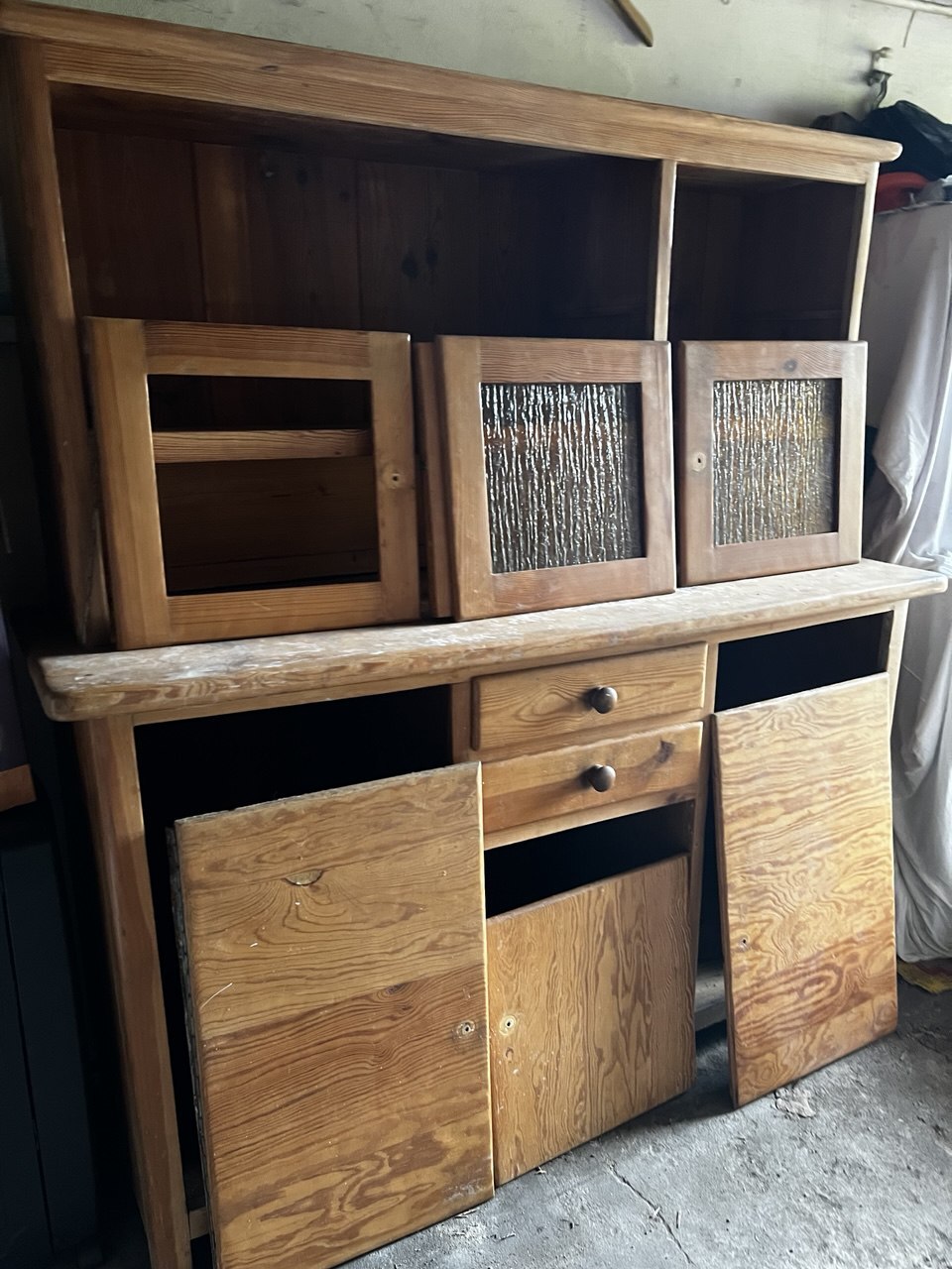 Kredens w stylu PRL, wykonany w 100% z litego drewna, w dobrym stanie technicznym, z usuniętymi warstwami starych farb.